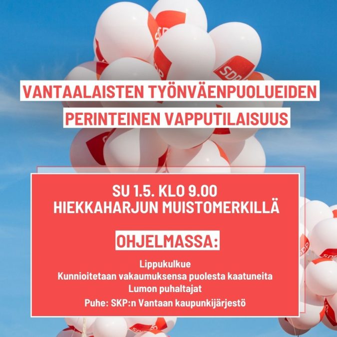 Tervetuloa vappupäivänä 1.5. klo 9.00 sankoin joukoin vantaalaisten työväenpuolueiden yhteiseen tilaisuuteen vakaumuksensa puolesta kaatuneiden muistomerkille Hiekkaharjuun.