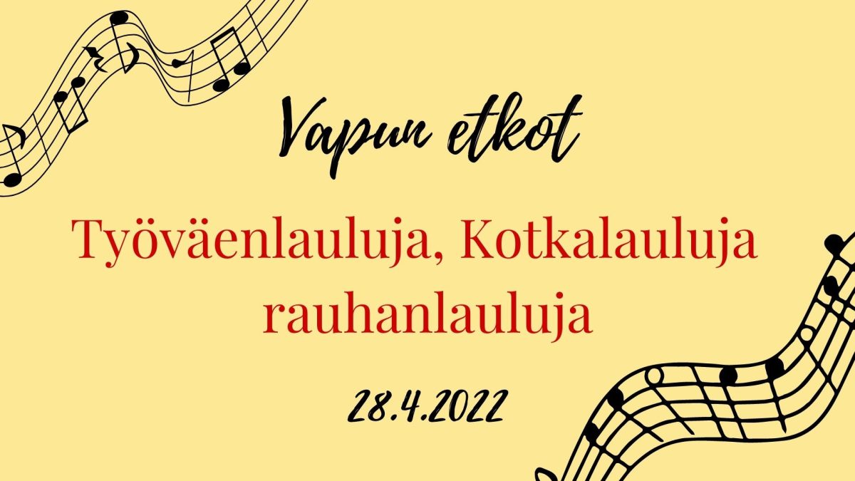 Vantaan Nuoret Kotkat järjestää Vapun etkot 28.4. klo 18.00 Tikso-kellarilla. Luvassa on työväenlauluja, kotkalauluja ja rauhanlauluja.